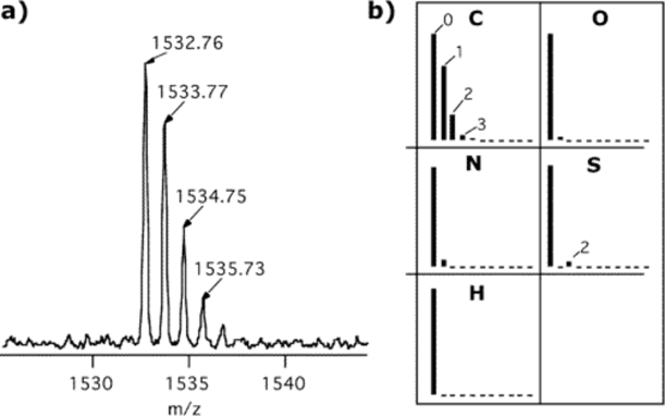 To add to the complexity, mass analyzers (which are the pieces of the instrument that actually measure the mass!) are able to see even the minor isotopic difference between molecules. All elements have isotopes; for example, carbon can be carbon-12 (~99%), carbon-13 (~1%), or even carbon-14 (~0.1%). A solution that contains many ions of the sample multiple could be present with different isotopes. In the mass spectrum (a graph of m/z (x-axis) versus signal intensity (y-axis)), this results in a visible “isotopic envelope” for each charge state/ionization method combo. Figure 1 shows an example of an isotopic envelope generated by an organic molecule that include carbon, oxygen, nitrogen, sulfur, and hydrogen.