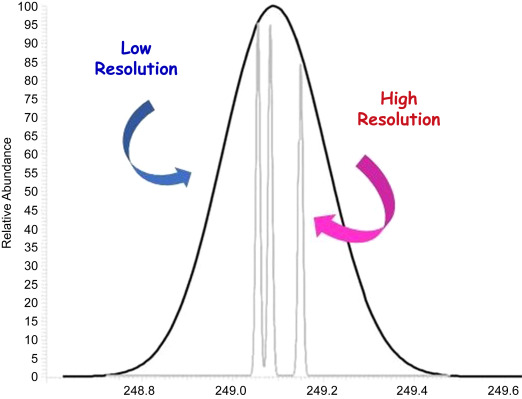 - Two spectra (x-axis = m/z) of the same sample were collected and overlayed, as shown below; one was collected with a low resolution (only measures integers) instrument, while one was collected with a high resolution (measures out to 0.XXXX) instrument. Explain, conceptually, (a) why the shapes are different between the two scans and (b) why more than one peak exists on the high resolution scan in comparison to the low resolution scan.