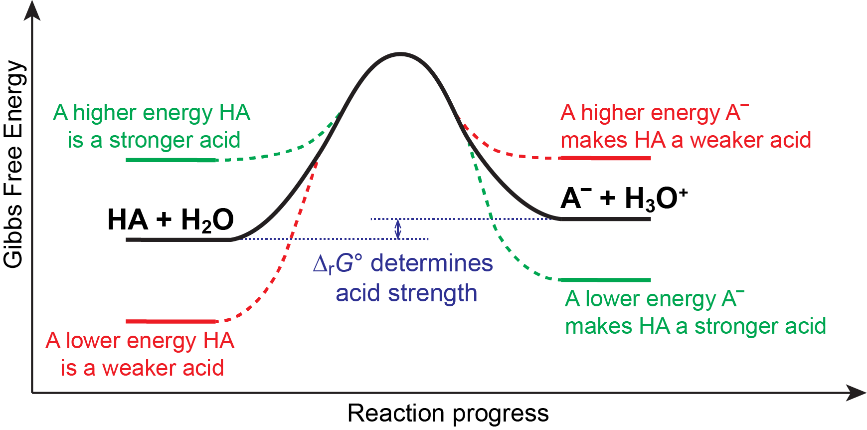anything that lowers the energy of A– relative to HA, or raises the energy of HA relative to A–, will make ΔrG° more negative, increasing Ka, and hence make HA a stronger acid. Similarly, anything that lowers the energy of HA relative to A–, or raises the energy of A– relative to HA, will make ΔrG° more positive, decreasing Ka, and hence make HA a weaker acid. This idea is illustrated pictorially below.
