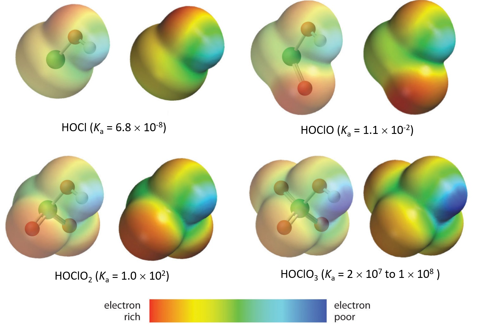 Also important is the effect of resonance stabilization in the conjugate base. For example, in the chlorite anion (ClO2–), the excess electron density is delocalized equally over both oxygen atoms, whereas in the hypochlorite ion (ClO–), the negative charge is largely localized on a single oxygen atom: