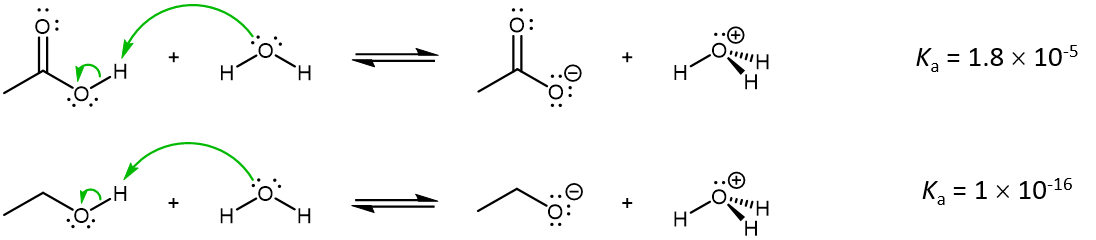 Let us consider two types of compounds, carboxylic acids (RCOOH) and alcohols (ROH), acting as an acid in an acid-base reaction. For both species, an O-H bond is broken during the acid-base reaction. For example, at 25 °C,