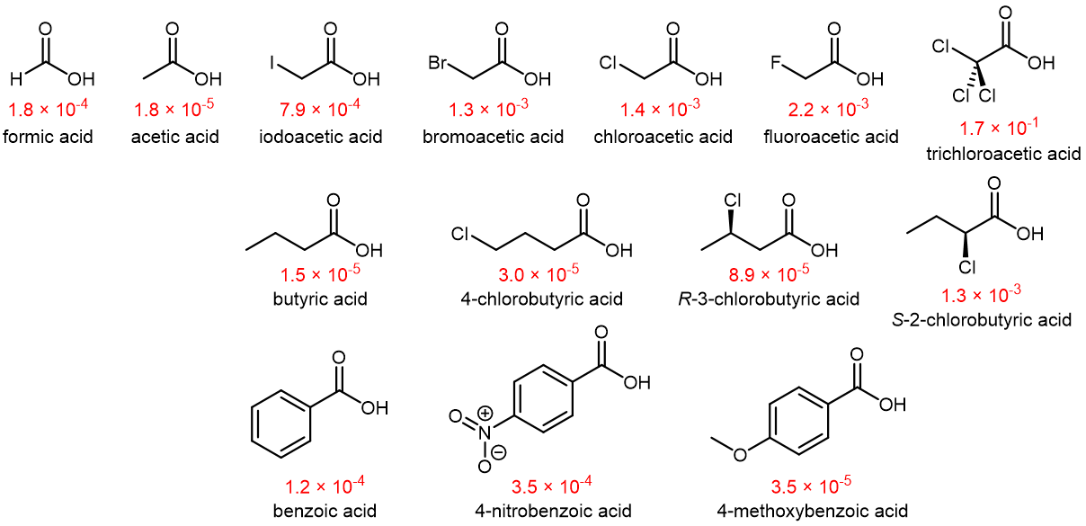 Atoms (or groups of atoms) in a molecule that are not directly bonded to the acidic H can also influence the molecule’s acidity. They can do so via an inductive effect, that is, they induce a polarization in the distribution of electrons within the molecule. This can be seen by studying the structures in Figure: Carboxylic Acids above. More electronegative substituents (F, Cl, Br) near the -COOH carboxyl group act to increase the acidity of the carboxylic acid. For example, fluoroacetic acid, CH2FCOOH, is significantly more acidic than acetic acid, CH3COOH.