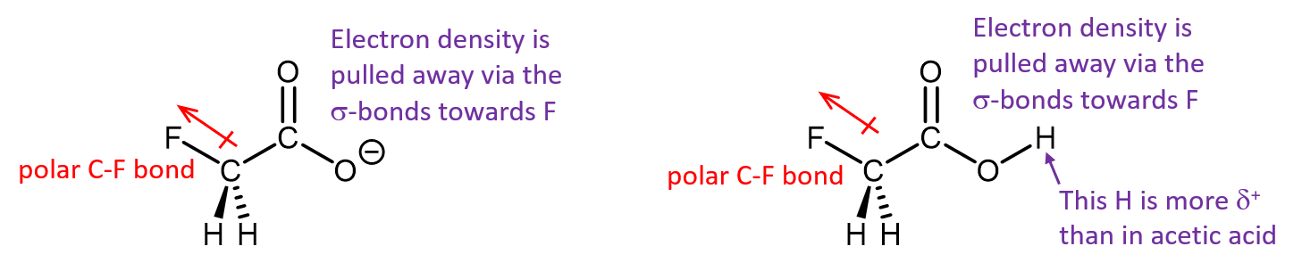 This inductive effect works in two ways: It stabilizes the anionic conjugate base by drawing electron density away from the negatively charged -COO– group (it is another way for the excess electron to delocalize to more atoms within the molecule). It also polarizes and weakens the O-H bond in the -COOH group by drawing electron density away from this bond in the acid, thereby facilitating ionization of hydrogen as H+.