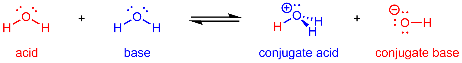 H2O is the base of its conjugate acid H3O+, and H2O is also the acid of its conjugate base OH. (However, H3O+ is not the conjugate acid of OH; these two species are not a conjugate acid-base pair because their structures do not differ by a single H+.)