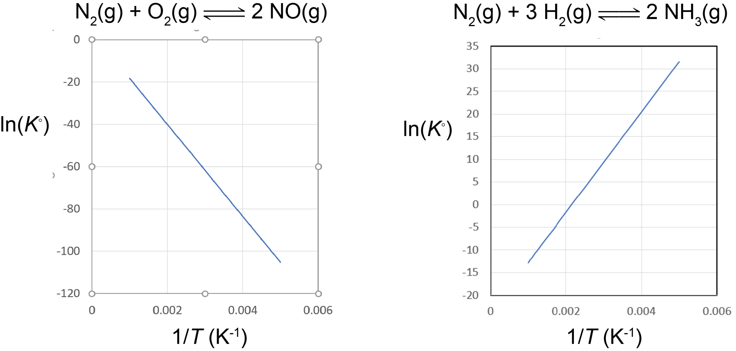 [latex]\text{ln}K^{\circ} = -\dfrac{{\Delta}_{\text{r}}H^{\circ}}{R}\left(\dfrac{1}{T}\right)\;+\;\dfrac{{\Delta}_{\text{r}}S^{\circ}}{R}[/latex]