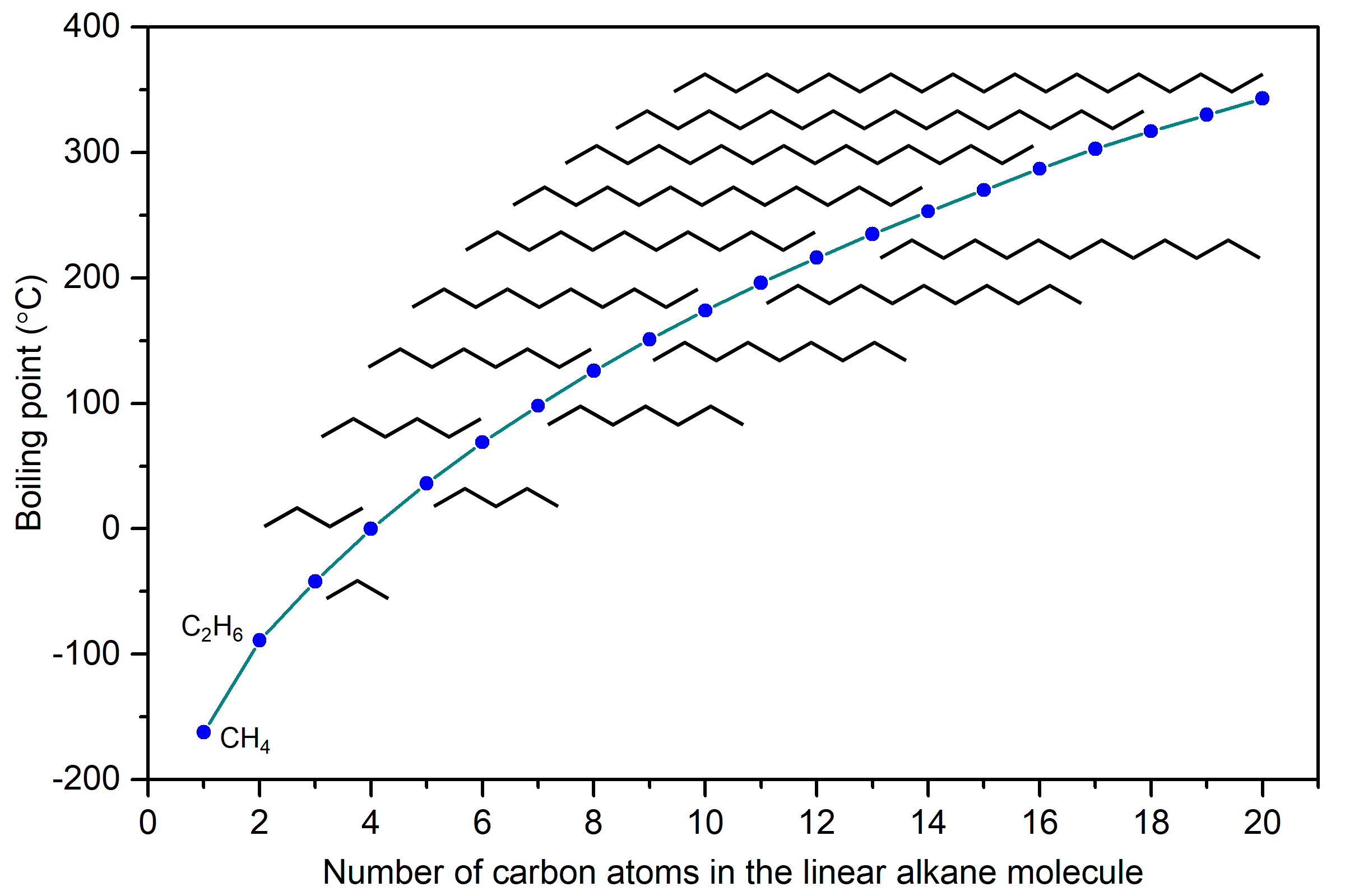 Figure: Boiling points of linear alkanes. Boiling points of linear alkanes increase as a function of number of carbon atoms in the molecule. The line structures of the n≥3 molecules are shown, where space permits.