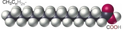 A typical fatty acid has a long, non-polar hydrocarbon chain and one end that often contains both a polar and ionic group. The polar head of the molecule interacts with water with little or no increase in entropy, unlike a hydrocarbon, where the lack of H-bonding interactions with water forces a more ordered shell of water molecules around the hydrocarbon molecule, leading to a decrease in entropy. On the other hand, in water the non-polar region of the molecule creates a decrease in entropy as water molecules are organized into a type of cage around it—an unfavorable outcome in terms of ΔS, and therefore ΔG as well. So, which end of the molecule “wins”? That is do such molecules dissolve in water or not? The answer is: Both! These amphipathic molecules become arranged in such a manner that their polar groups are in contact with the water, while their non-polar regions are not. (See whether you can draw out such an arrangement, remembering to include the water molecules in your drawing.)