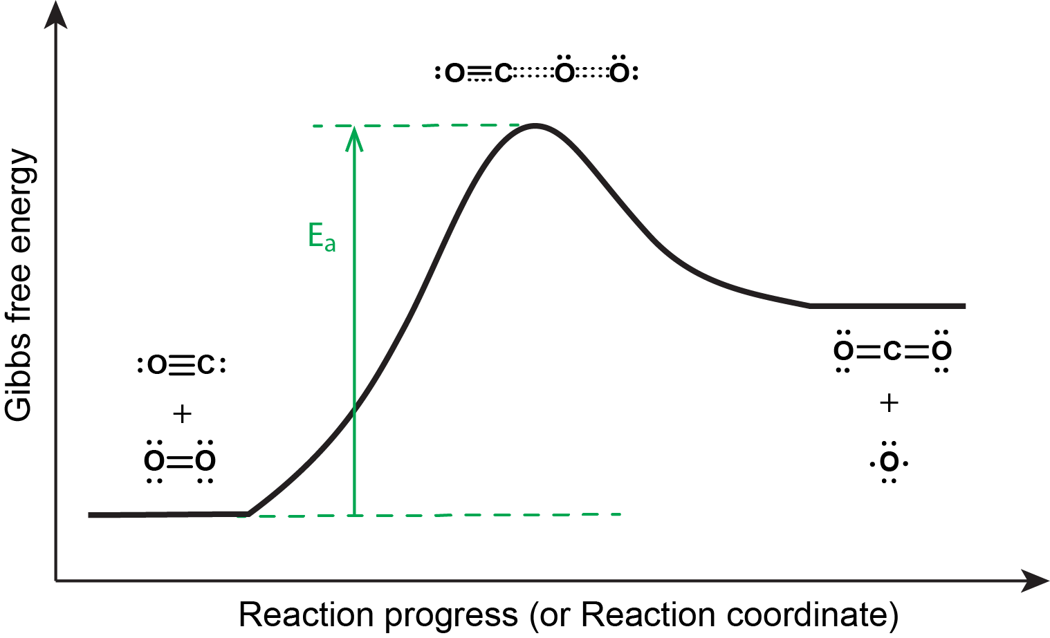 Figure: Reaction energy diagram: CO(g) + O2(g) → CO2(g) + O(g) reaction. The activated complex or transition state (dotted lines indicate bonds being broken and formed) corresponds to the highest energy point along the reaction coordinate.