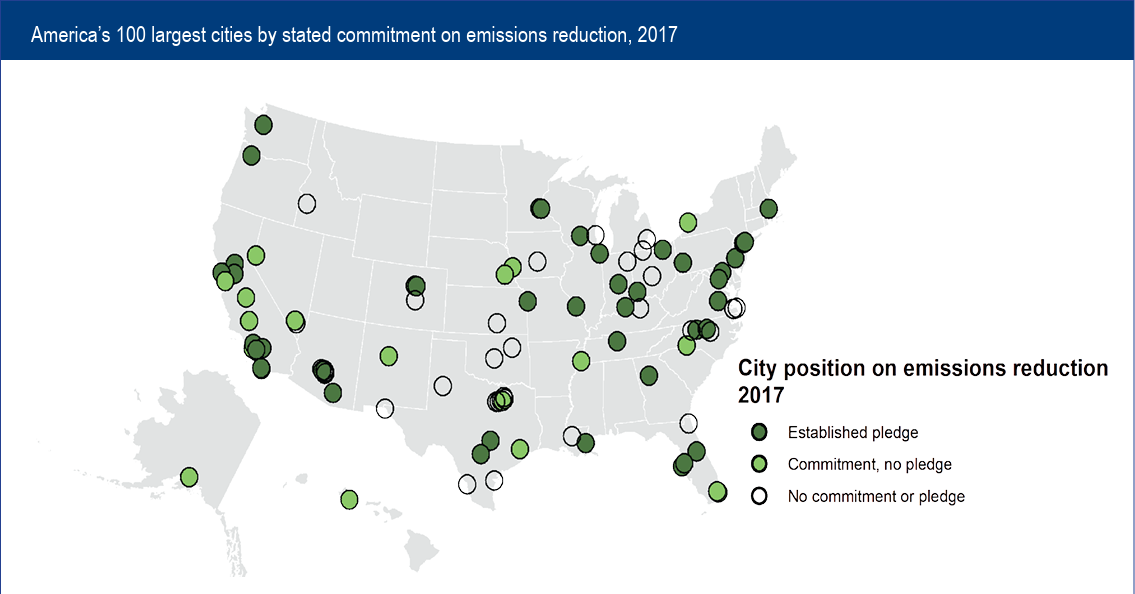 According to Brookings Institute, of the 100 most populous cities in the U.S., about half (45, “Established pledge” on map below) have established GHG reduction targets and corresponding inventories necessary to track progress. 22 have committed to reducing emissions but have not established targets or completed a baseline inventory upon which to base a reduction plan (“Commitment, no pledge” on map). The 45 established pledges, if met, would reduce U.S. GHG emissions by roughly 6% of what total emissions were in 2017.