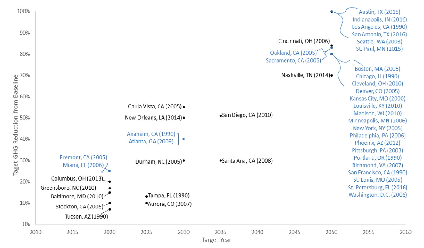 Similar to Paris Agreement national targets, each city plan differs in timeline, specific emissions reduction targets, amount of detail, accounting/reporting mechanisms, and enforcement strategies. Only 54% of plans explicitly aim to achieve “net-zero emissions by 2050.” Some plans end at 20% or 50% in 2020, 2030 or 2035. Only one-third have detailed benchmarks and reporting. The Figure below shows the final targeted percent reduction in emissions and the final year by which the reduction should be fully achieved. The values in parentheses next to the city names correspond to the baseline year of their CAP. Values in blue represent cities with the same reduction target and year.