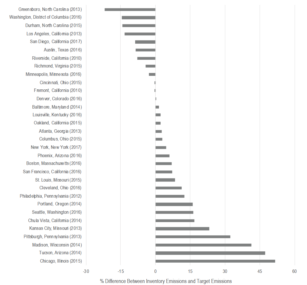 About two-thirds of cities are currently behind their targeted emission levels. On average, cities will still need to reduce their annual emissions by 64% by 2050 in order to reach their ultimate reduction targets. The next figure displays the progress of cities towards their goals as the difference between their most recent inventory and the targeted emission level in the year of the inventory. A number of factors may impact a city’s progress towards its stated goals. First is the ambition of the target in the first place. Some targets are easier to achieve than others. As mentioned above, the targets of some cities, like Greensboro N.C., only seek to reduce GHG emissions of city operations while others like Chicago and Madison seek to reduce city-wide GHG emissions. Moreover, as shown in the previous figure, city commitments vary widely in terms of the timeline and the level of reduction commitments. A city may lay out a vision in a CAP but face political hurdles in implementing the plan. In addition, many factors affecting the city-wide GHG emissions are not within the control of city government. A city government can create policies and plans to spur GHG emission reductions but reductions only occur through actions by electric utilities, companies, and residents of the city. A city’s growth will increase its energy demand (particularly AI data centers) and complicate the shift from a fossil fuel energy supply. Federal and state policies and programs will also help or hinder a city reaching its reduction target.