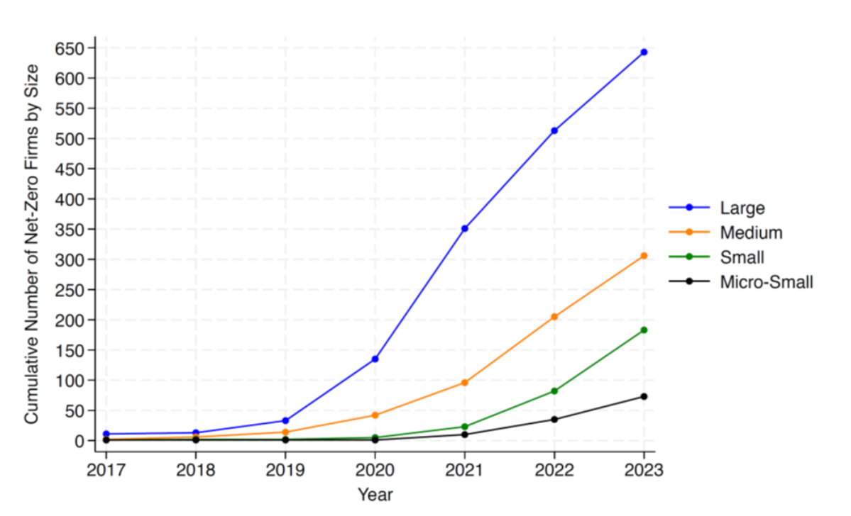 Among the world’s largest 2,000 companies, it has been estimated that more than half have set reduction targets. These commitments are mostly voluntary, though European countries and the U.S. state of California are introducing mandatory reporting standards, for companies over a certain size. Besides these regulations, companies have a number of incentives for disclosing emissions and announcing targets publicly including public relations, responding to stockholders, being ahead of government regulations and staying competitive. Commitments have increased significantly since 2019 and are more common among large companies who hold influence over markets and policies, and have enough assets to make bold targets with confidence. They also are more likely to have operations within government jurisdictions requiring them to reduce emissions. This figure shows the cumulative number of firms having made a Net Zero commitment by firm size [Note that firm size is measured by assets: “Large” ($10 billion or more), “Medium” ($2 billion to $10 billion), “Small” ($250 million to $2 billion), and “Micro-small” ($250 million or less).]