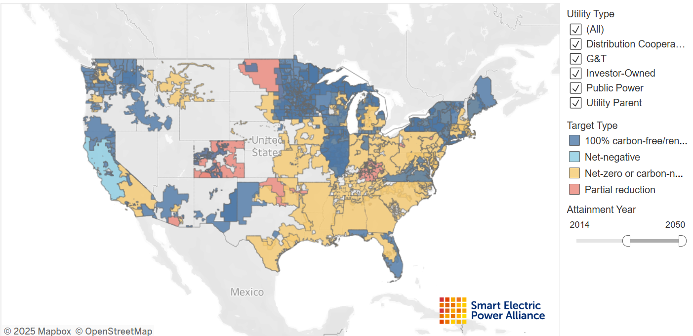 This map from Smart Electric Power Alliance shows utility reduction targets. Dark blue is “100% carbon-free/renewable energy” (no use of carbon credits/offsets), light blue “net-negative,” light orange “net-zero or carbon-neutral” and light red is a commitment to “partial reductions.” Many of these commitments are recent and their effectiveness has not yet been evaluated. There are both reasons for optimism, with some utilities on track to meet their targets, and reasons for concern with examples of utilities backsliding on their targets.
